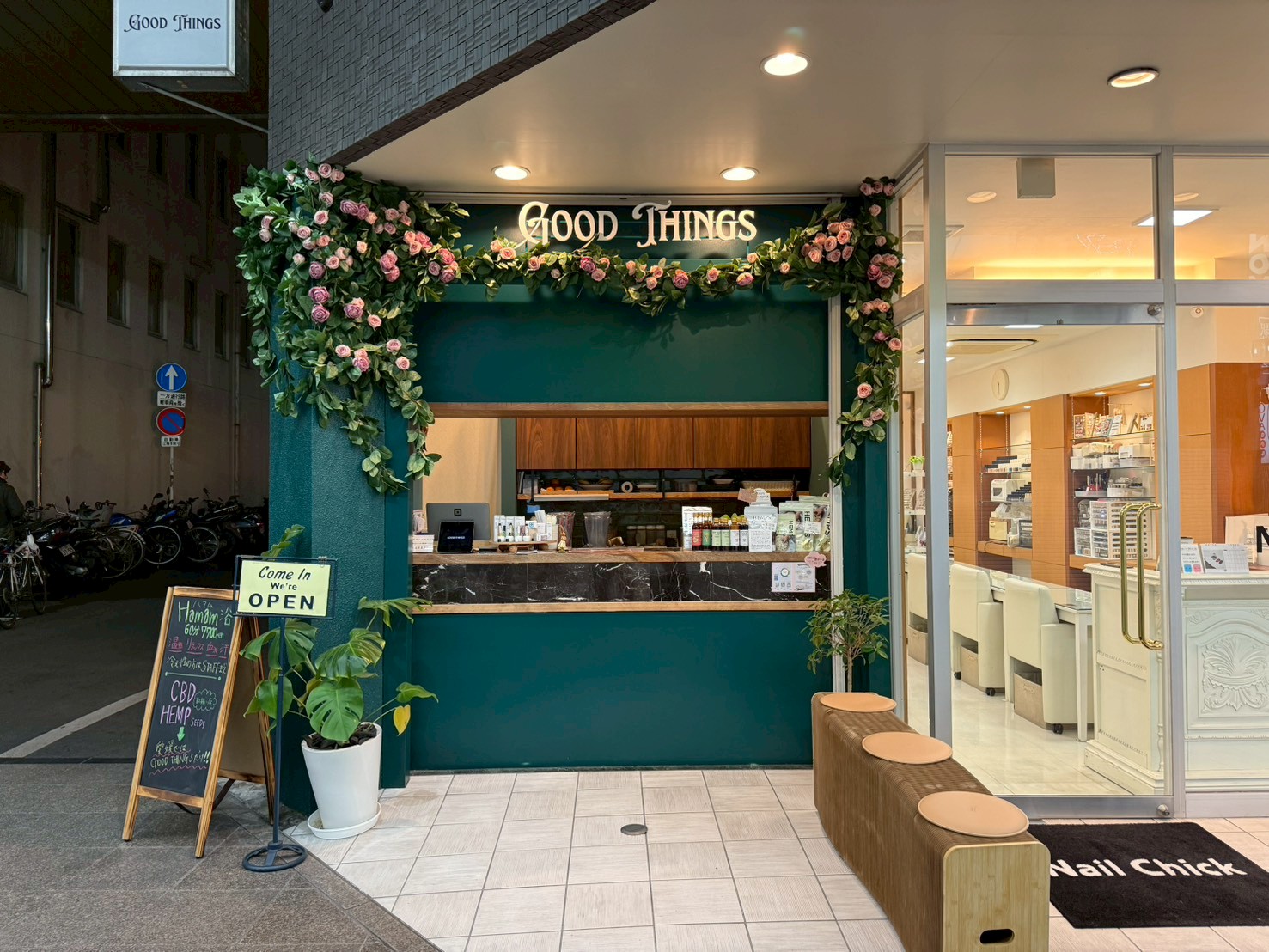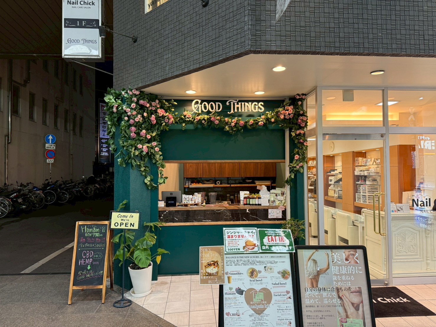 松山市中心部、銀天街の一角にオープンした「GOOD THINGS」は、ジューススタンドとリラクゼーションサロンが融合した新感覚のウェルネススポットです。