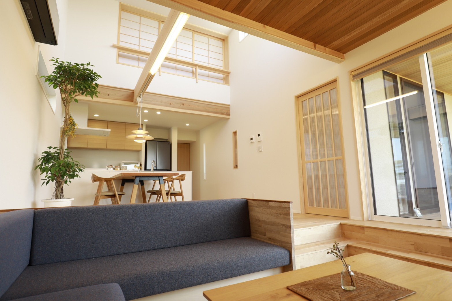 段差と吹き抜けによって、空間にゆるやかなつながりを生み出した住まい。